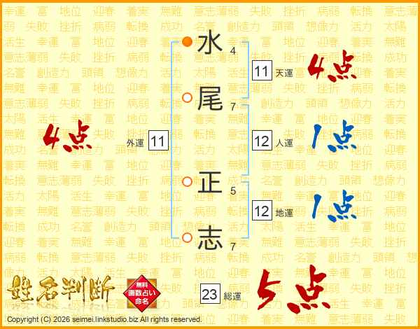 生活面を象徴する運勢です。外部から受ける影響力を表し、結婚運、家庭運や職場、環境への順応性を表します。総運から人運を引いた画数。姓や名が1文字の場合を除く。