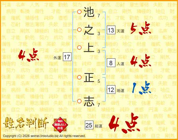 生活面を象徴する運勢です。外部から受ける影響力を表し、結婚運、家庭運や職場、環境への順応性を表します。総運から人運を引いた画数。姓や名が1文字の場合を除く。