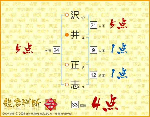 あなたの人生を表す1番重要な運勢です。生涯を通じて影響する総合運となり、主に50歳以降の晩年期に影響を及ぼします。苗字と名前の合計画数。