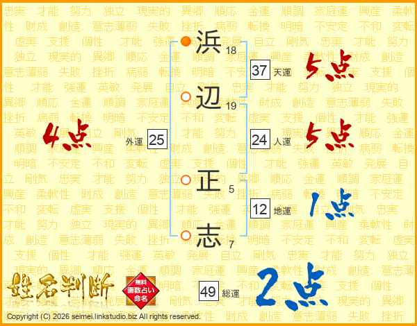 あなたの人生を表す1番重要な運勢です。生涯を通じて影響する総合運となり、主に50歳以降の晩年期に影響を及ぼします。苗字と名前の合計画数。