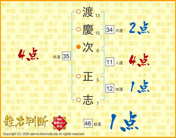 渡(13画)慶(15画)次(6画) 正(5画)志(7画)
