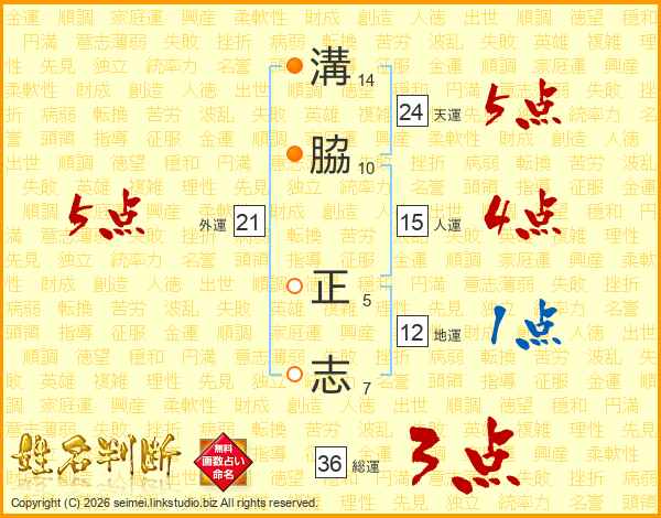 あなたの人生を表す1番重要な運勢です。生涯を通じて影響する総合運となり、主に50歳以降の晩年期に影響を及ぼします。苗字と名前の合計画数。