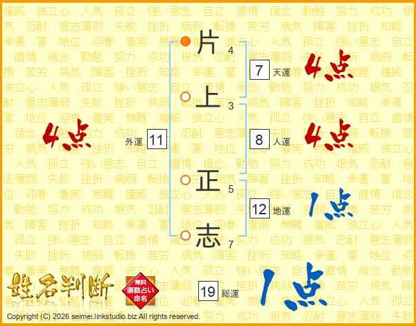 あなたの人生を表す1番重要な運勢です。生涯を通じて影響する総合運となり、主に50歳以降の晩年期に影響を及ぼします。苗字と名前の合計画数。