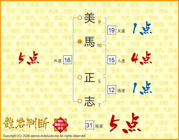 美(9画)馬(10画) 正(5画)志(7画)