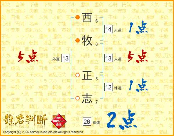 生活面を象徴する運勢です。外部から受ける影響力を表し、結婚運、家庭運や職場、環境への順応性を表します。総運から人運を引いた画数。姓や名が1文字の場合を除く。