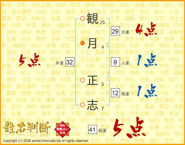 家系が持つ宿命的な運勢を表します。祖先から受け継いだ苗字ですので自分の力が及びません。家柄を象徴します。苗字の合計画数。