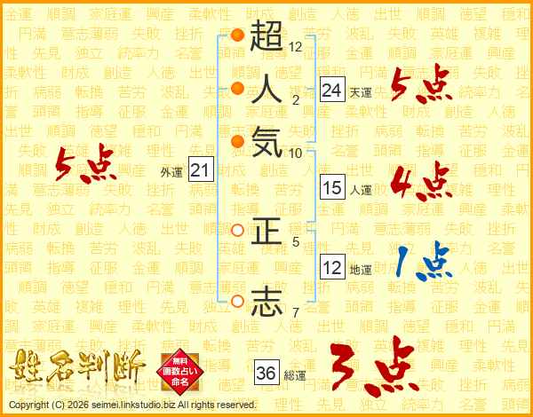 超(12画)人(2画)気(10画) 正(5画)志(7画)