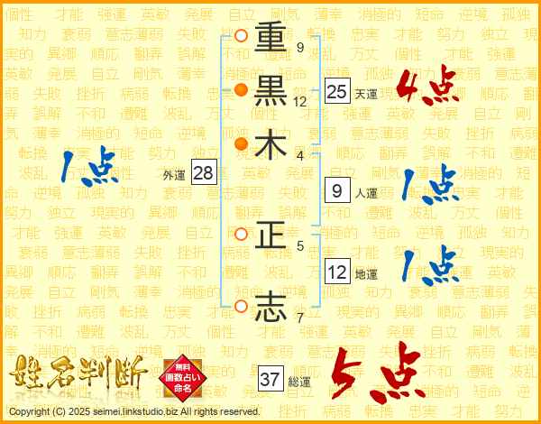 重(9画)黒(12画)木(4画) 正(5画)志(7画)
