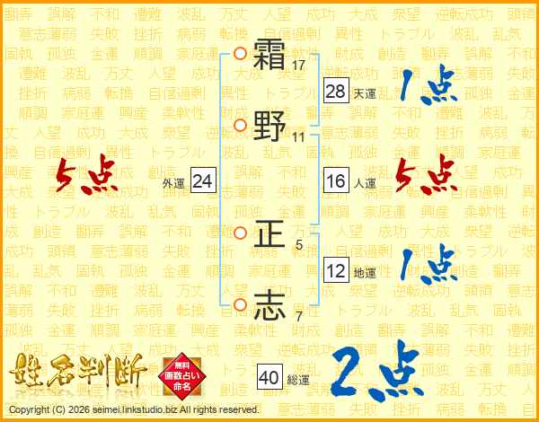 生活面を象徴する運勢です。外部から受ける影響力を表し、結婚運、家庭運や職場、環境への順応性を表します。総運から人運を引いた画数。姓や名が1文字の場合を除く。