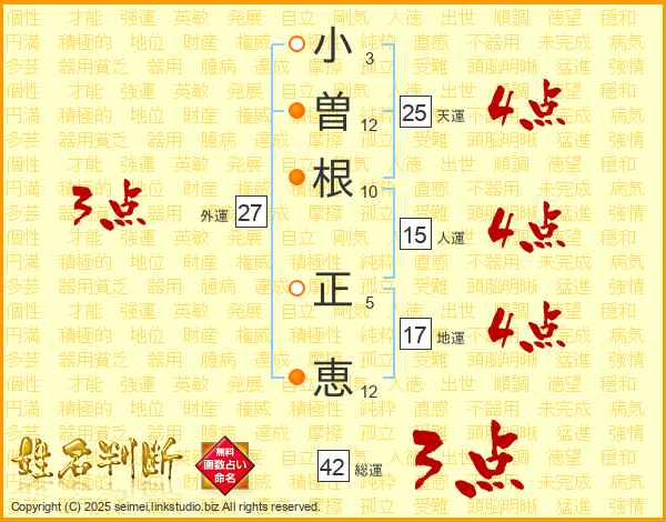 小(3画)曽(12画)根(10画) 正(5画)恵(12画)