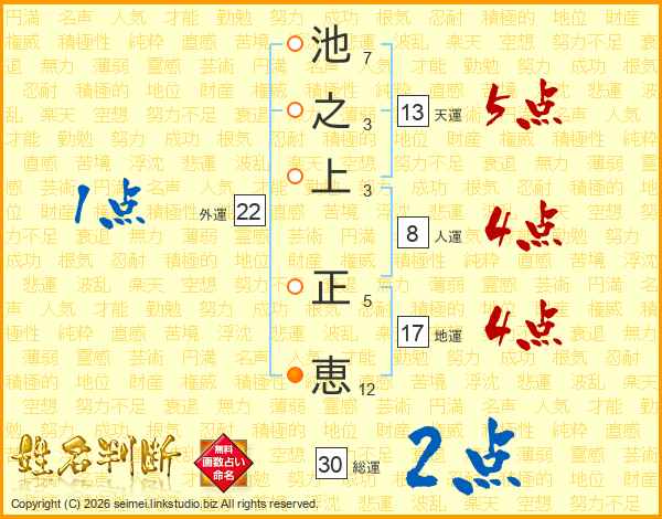 池(7画)之(3画)上(3画) 正(5画)恵(12画)