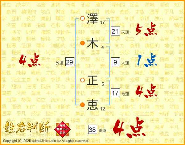 澤(17画)木(4画) 正(5画)恵(12画)