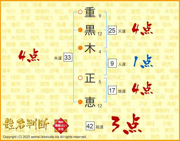 重(9画)黒(12画)木(4画) 正(5画)恵(12画)