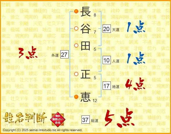 長(8画)谷(7画)田(5画) 正(5画)恵(12画)