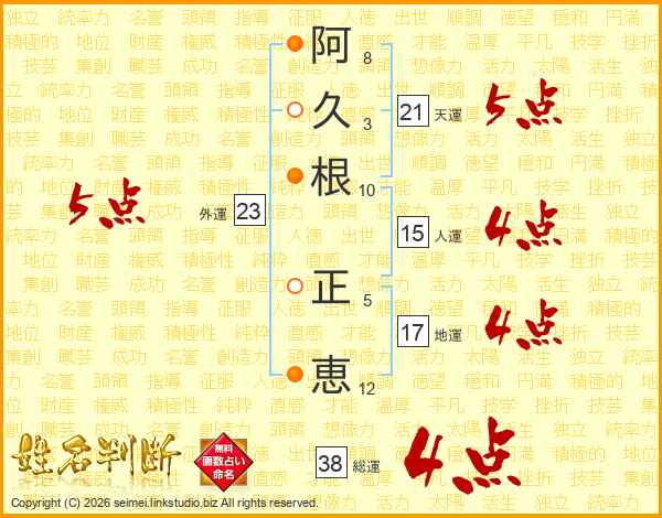 阿(8画)久(3画)根(10画) 正(5画)恵(12画)