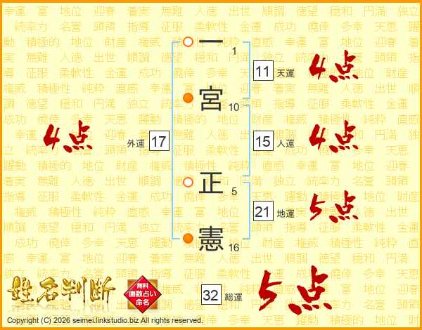 生活面を象徴する運勢です。外部から受ける影響力を表し、結婚運、家庭運や職場、環境への順応性を表します。総運から人運を引いた画数。姓や名が1文字の場合を除く。