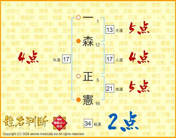 あなたの人生を表す1番重要な運勢です。生涯を通じて影響する総合運となり、主に50歳以降の晩年期に影響を及ぼします。苗字と名前の合計画数。