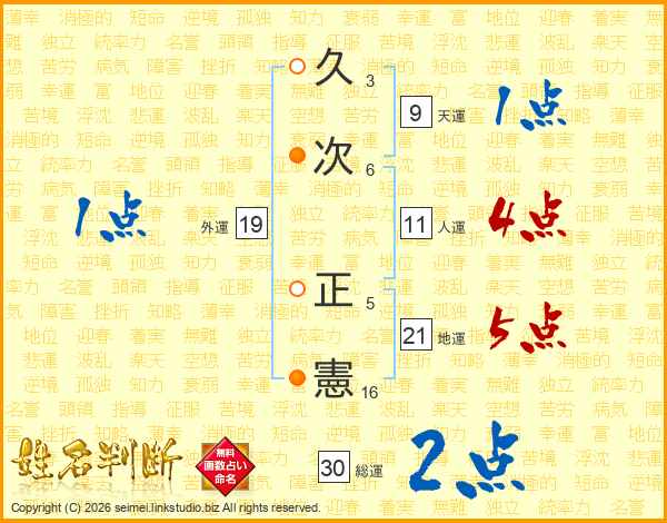 あなたの人生を表す1番重要な運勢です。生涯を通じて影響する総合運となり、主に50歳以降の晩年期に影響を及ぼします。苗字と名前の合計画数。
