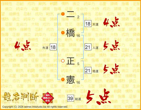 あなたの人生を表す1番重要な運勢です。生涯を通じて影響する総合運となり、主に50歳以降の晩年期に影響を及ぼします。苗字と名前の合計画数。