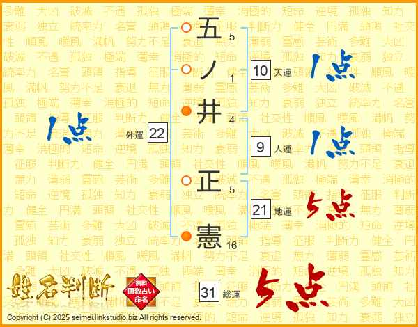 五(5画)ノ(1画)井(4画) 正(5画)憲(16画)