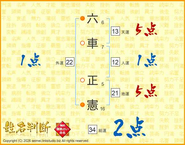 あなたの人生を表す1番重要な運勢です。生涯を通じて影響する総合運となり、主に50歳以降の晩年期に影響を及ぼします。苗字と名前の合計画数。