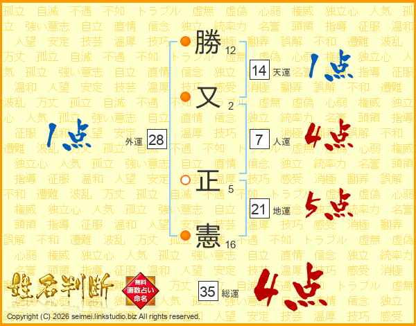 生活面を象徴する運勢です。外部から受ける影響力を表し、結婚運、家庭運や職場、環境への順応性を表します。総運から人運を引いた画数。姓や名が1文字の場合を除く。