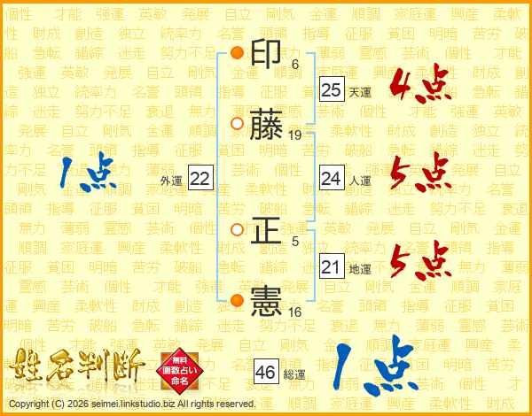 家系が持つ宿命的な運勢を表します。祖先から受け継いだ苗字ですので自分の力が及びません。家柄を象徴します。苗字の合計画数。