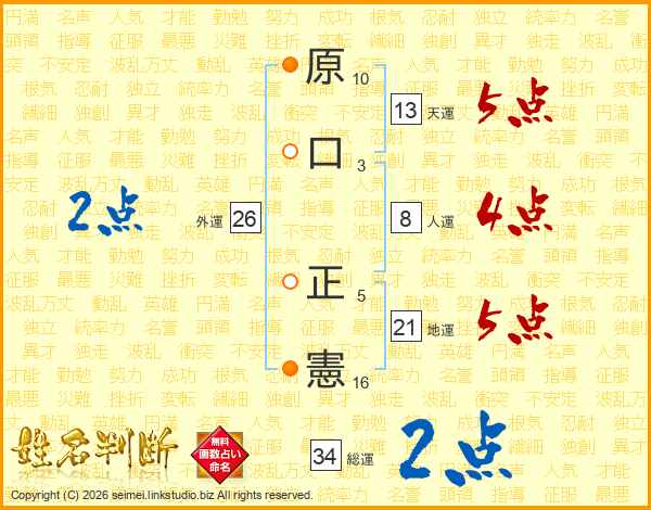 あなたの人生を表す1番重要な運勢です。生涯を通じて影響する総合運となり、主に50歳以降の晩年期に影響を及ぼします。苗字と名前の合計画数。