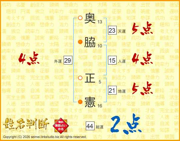 奥(13画)脇(10画) 正(5画)憲(16画)