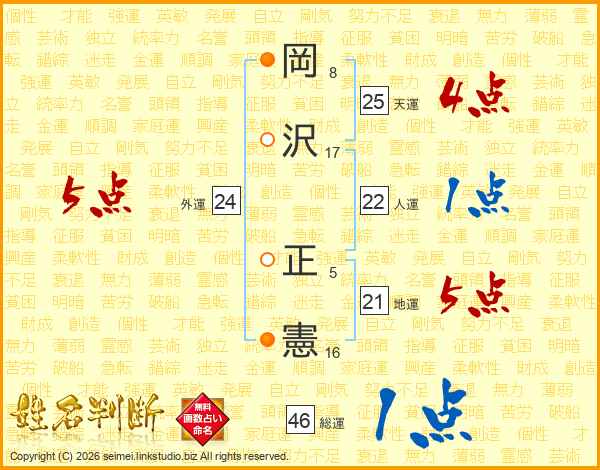 岡(8画)沢(17画) 正(5画)憲(16画)