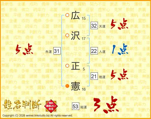 広(15画)沢(17画) 正(5画)憲(16画)