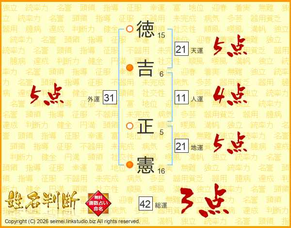 徳(15画)吉(6画) 正(5画)憲(16画)