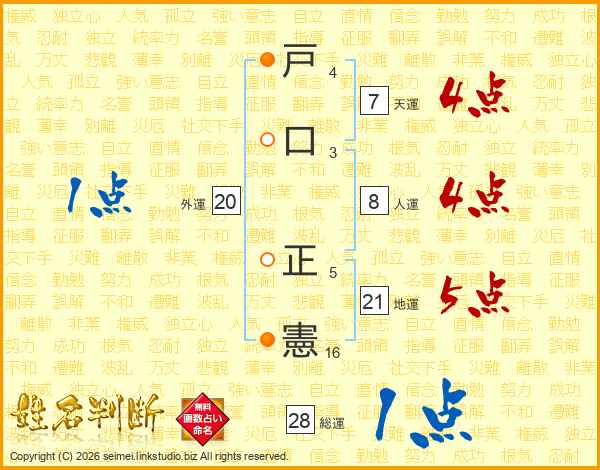 あなたの人生を表す1番重要な運勢です。生涯を通じて影響する総合運となり、主に50歳以降の晩年期に影響を及ぼします。苗字と名前の合計画数。
