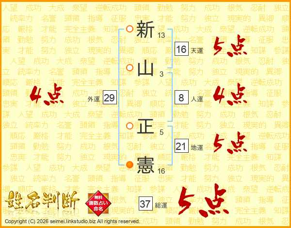 新(13画)山(3画) 正(5画)憲(16画)