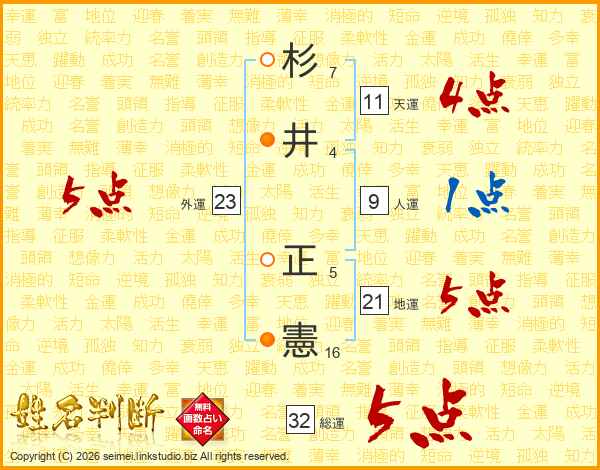 杉(7画)井(4画) 正(5画)憲(16画)