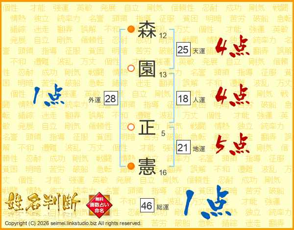 あなたの人生を表す1番重要な運勢です。生涯を通じて影響する総合運となり、主に50歳以降の晩年期に影響を及ぼします。苗字と名前の合計画数。