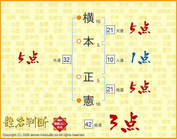 あなたの人生を表す1番重要な運勢です。生涯を通じて影響する総合運となり、主に50歳以降の晩年期に影響を及ぼします。苗字と名前の合計画数。