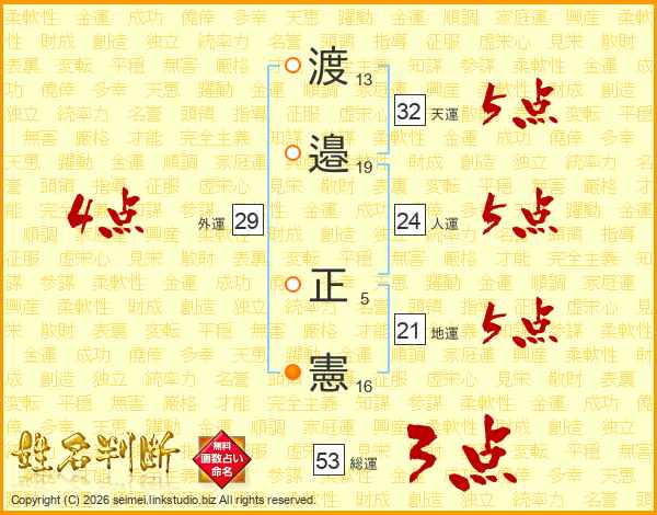渡(13画)邉(19画) 正(5画)憲(16画)