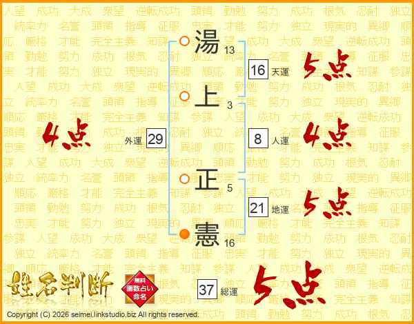 湯(13画)上(3画) 正(5画)憲(16画)
