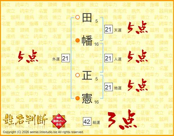 田(5画)幡(16画) 正(5画)憲(16画)