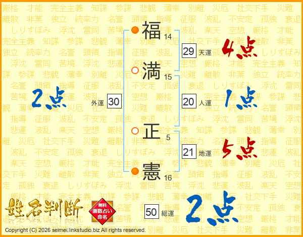生活面を象徴する運勢です。外部から受ける影響力を表し、結婚運、家庭運や職場、環境への順応性を表します。総運から人運を引いた画数。姓や名が1文字の場合を除く。