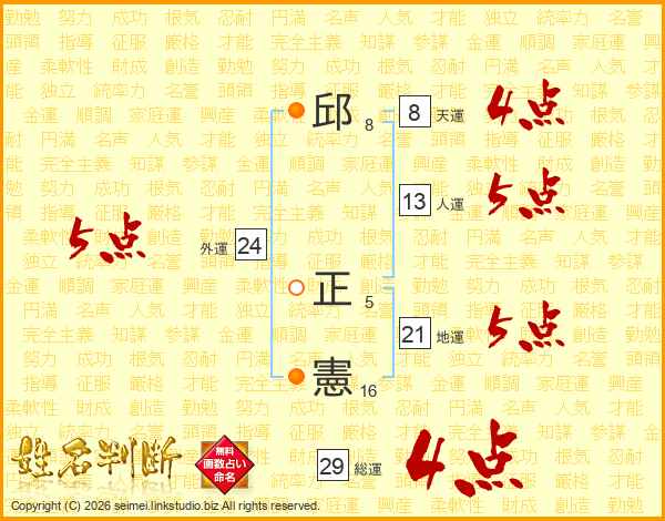 あなたの人生を表す1番重要な運勢です。生涯を通じて影響する総合運となり、主に50歳以降の晩年期に影響を及ぼします。苗字と名前の合計画数。