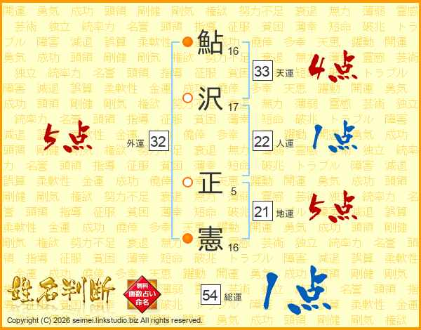 鮎(16画)沢(17画) 正(5画)憲(16画)