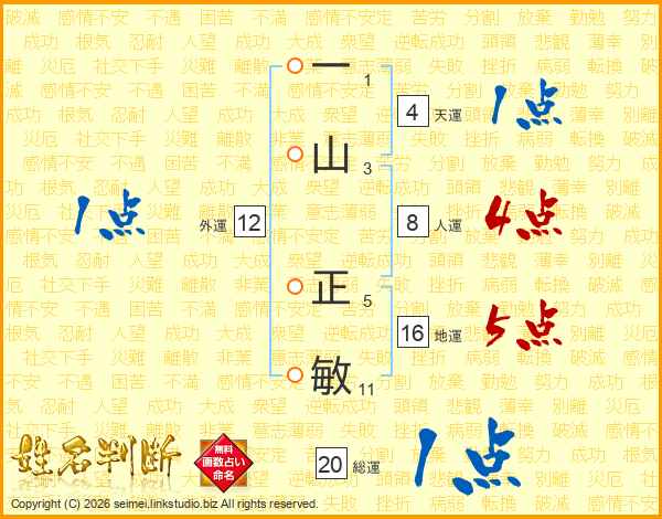 生活面を象徴する運勢です。外部から受ける影響力を表し、結婚運、家庭運や職場、環境への順応性を表します。総運から人運を引いた画数。姓や名が1文字の場合を除く。