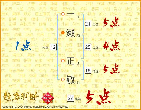 一(1画)瀬(20画) 正(5画)敏(11画)