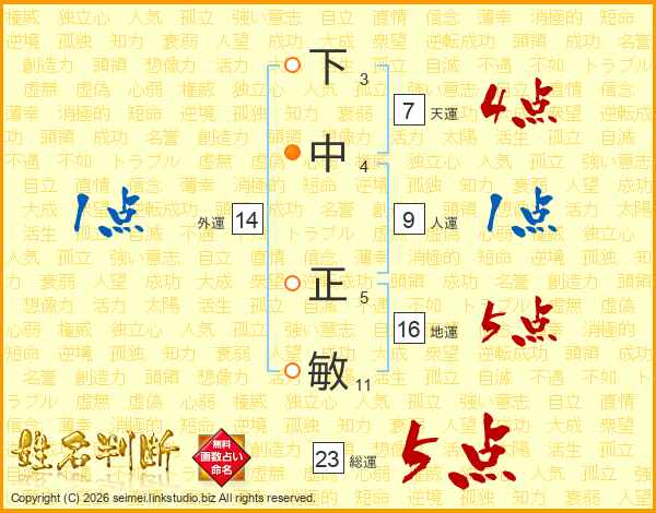 生活面を象徴する運勢です。外部から受ける影響力を表し、結婚運、家庭運や職場、環境への順応性を表します。総運から人運を引いた画数。姓や名が1文字の場合を除く。