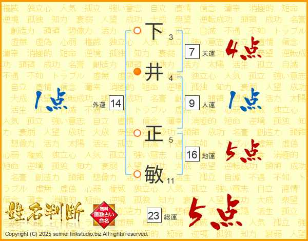 生活面を象徴する運勢です。外部から受ける影響力を表し、結婚運、家庭運や職場、環境への順応性を表します。総運から人運を引いた画数。姓や名が1文字の場合を除く。