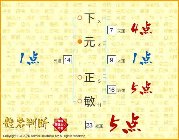 生活面を象徴する運勢です。外部から受ける影響力を表し、結婚運、家庭運や職場、環境への順応性を表します。総運から人運を引いた画数。姓や名が1文字の場合を除く。