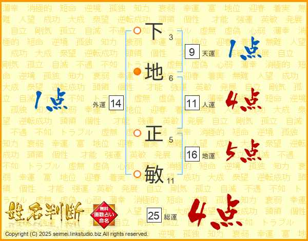 生活面を象徴する運勢です。外部から受ける影響力を表し、結婚運、家庭運や職場、環境への順応性を表します。総運から人運を引いた画数。姓や名が1文字の場合を除く。