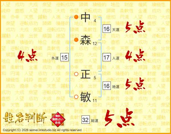 あなたの人生を表す1番重要な運勢です。生涯を通じて影響する総合運となり、主に50歳以降の晩年期に影響を及ぼします。苗字と名前の合計画数。